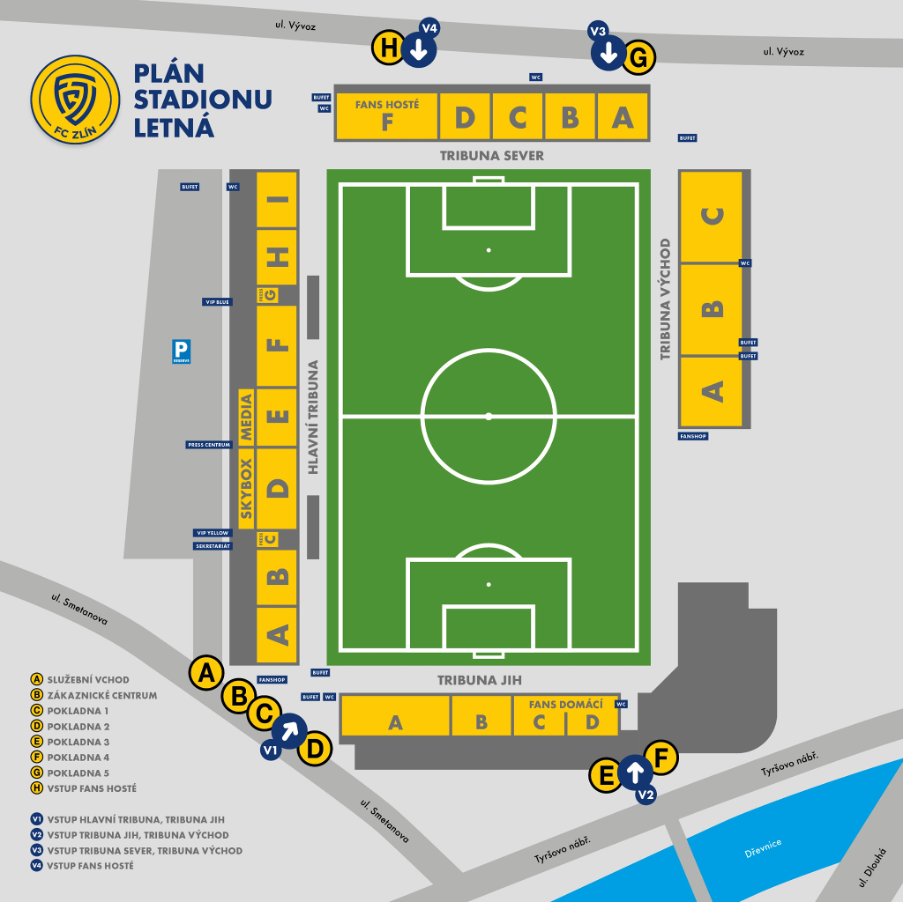 Před příchodem na stadion doporučujeme nastudovat návtěvní řád. Do sektoru hostů se dostanete přes ulici Vývoz, kde najdete sektor F na severní tribuně.