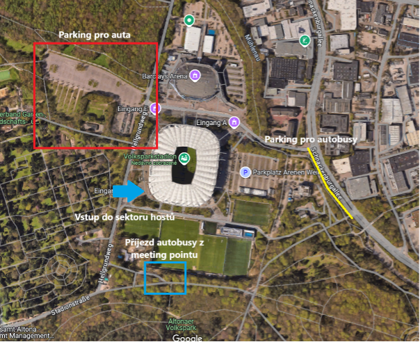 Přímo u Volksparkstadionu lze zaparkovat na parkoviti pro veřejnost P-ROT. Připravte si prosím 9 euro v hotovosti či kartu. MAPA ZDE.