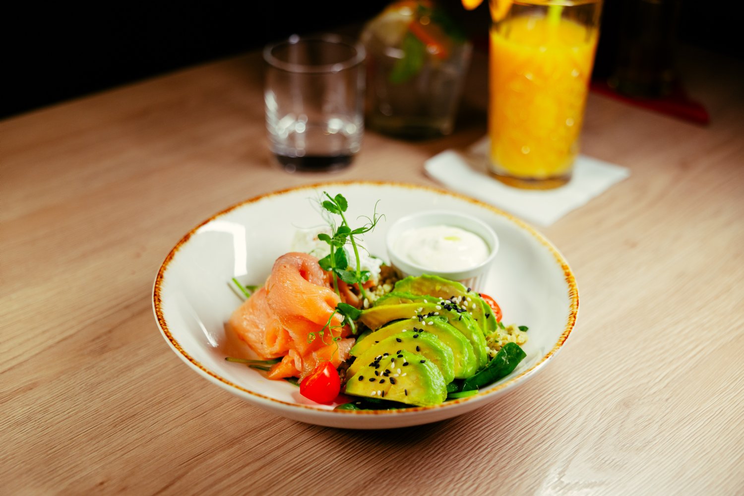 losos, krájené avokádo, sezamové semínko a jemný jogurtovo-citrónový dip.
