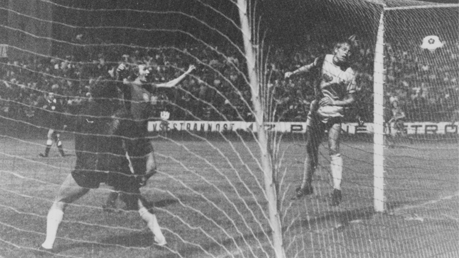 kodovka na podzim 1974 překvapivě zvítězila nad praskou Duklou 2:1. Ivan Bican střílí hlavou druhý gól. Brankář Ivo Viktor je v roli diváka, stoper Václav Samek se marně snaí zasáhnout.