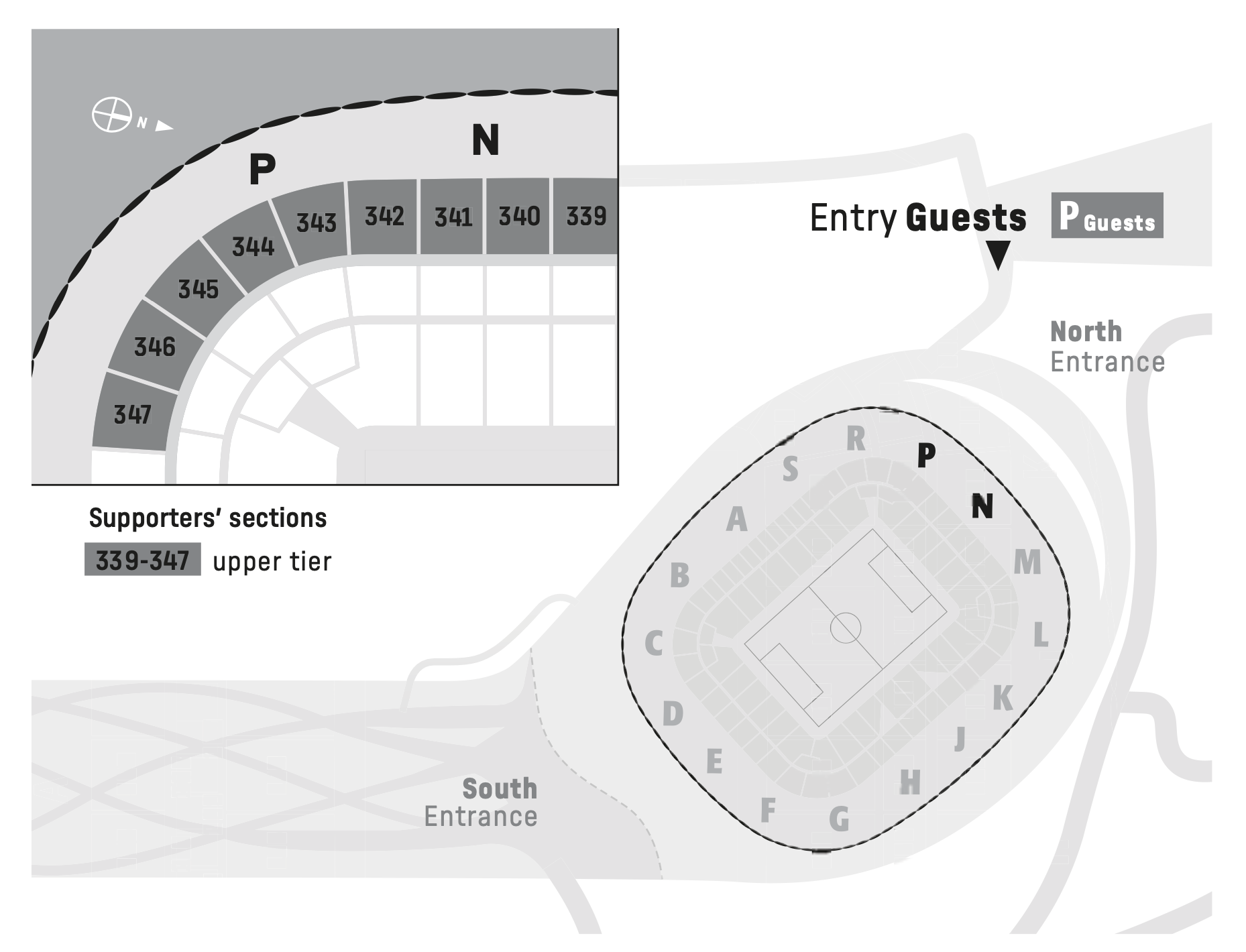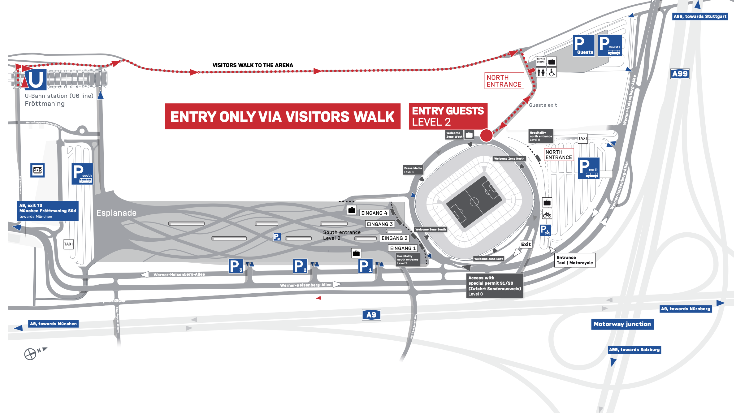 Pro fanouky mířící do plzeňských sektorů P a N vyznačených čísly 339-347 je připraven speciální vchod pro hostující příznivce, který můete vidět v plánku níe. V plánku je rovně vyznačeno, kudy se do sektoru dostanete, pokud přijedete ke stadionu metrem z centra Mnichova. ádáme vechny fanouky, aby vyuili do výe uvedených sektorů právě tento vstup.
